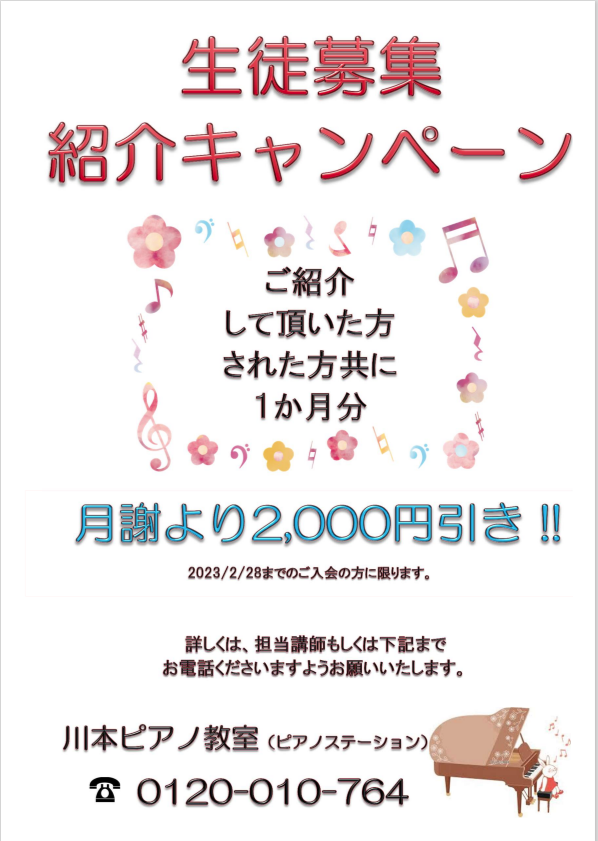 今ご入会の方にはとってもかわいい鍵盤柄のポーチをプレゼントしております。・・・[ 続きを見る ]